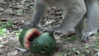 视频的主角是一只活泼可爱的小猴子,它正坐在树上,手里拿着一个又大又圆的西瓜。小猴子瞪大了眼睛,一脸的期待,仿佛在说:“这瓜,我要怎么吃呢?”它拿起西瓜,用力一拍,瓜皮应声而裂。小猴子兴奋地跳了起来,开始大口大口地吃起来。